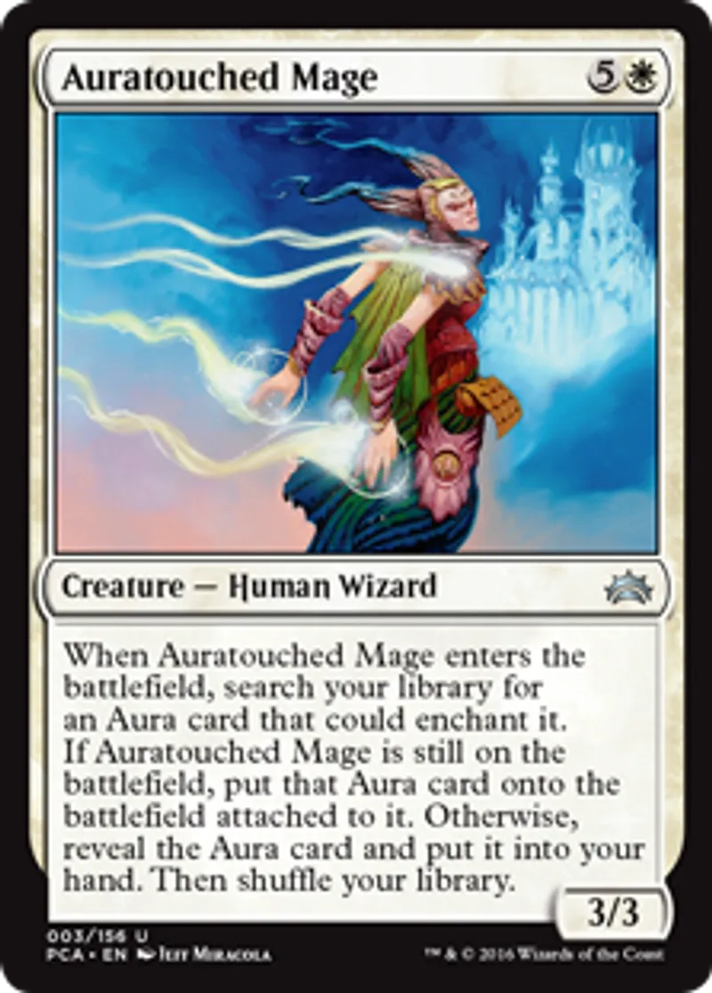 | Oracle Text | When Auratouched Mage enters the battlefield, search your library for an Aura card that could enchant it. If Auratouched Mage is still on the battlefield, put that Aura card onto the battlefield attached to it. Otherwise, reveal the Aura card and put it into your hand. Then shuffle your library. | ||