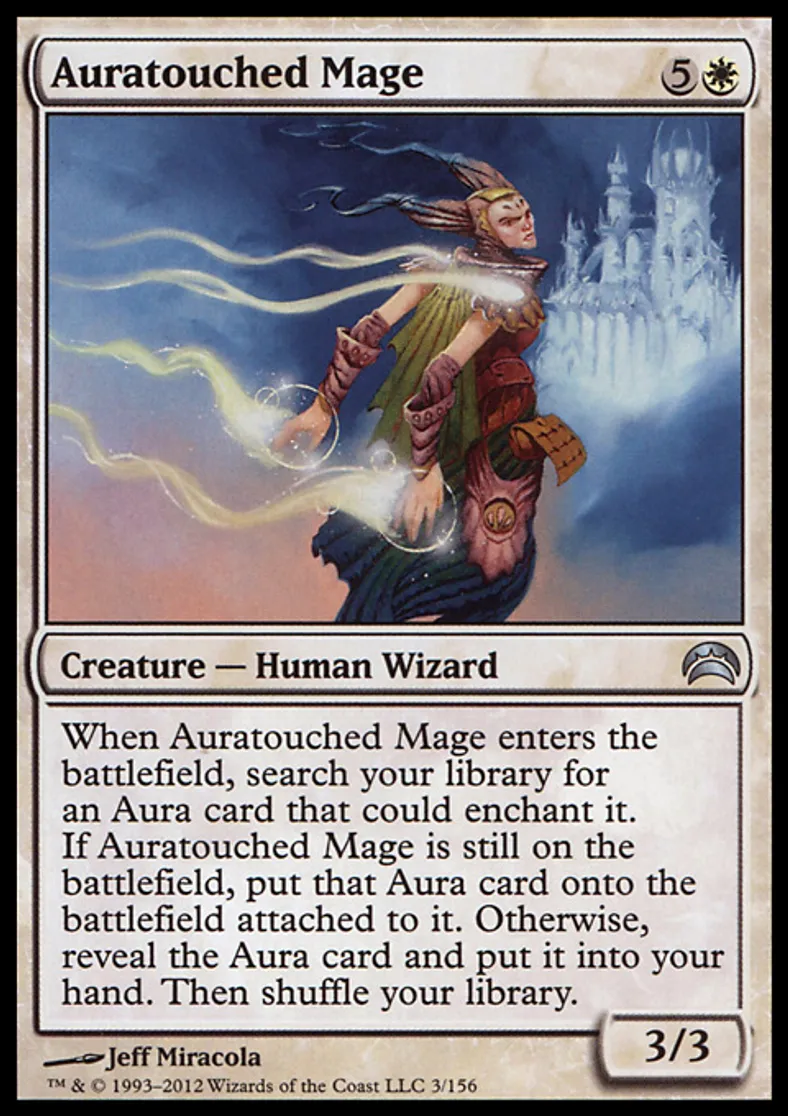| Oracle Text | When Auratouched Mage enters the battlefield, search your library for an Aura card that could enchant it. If Auratouched Mage is still on the battlefield, put that Aura card onto the battlefield attached to it. Otherwise, reveal the Aura card and put it into your hand. Then shuffle your library. | ||