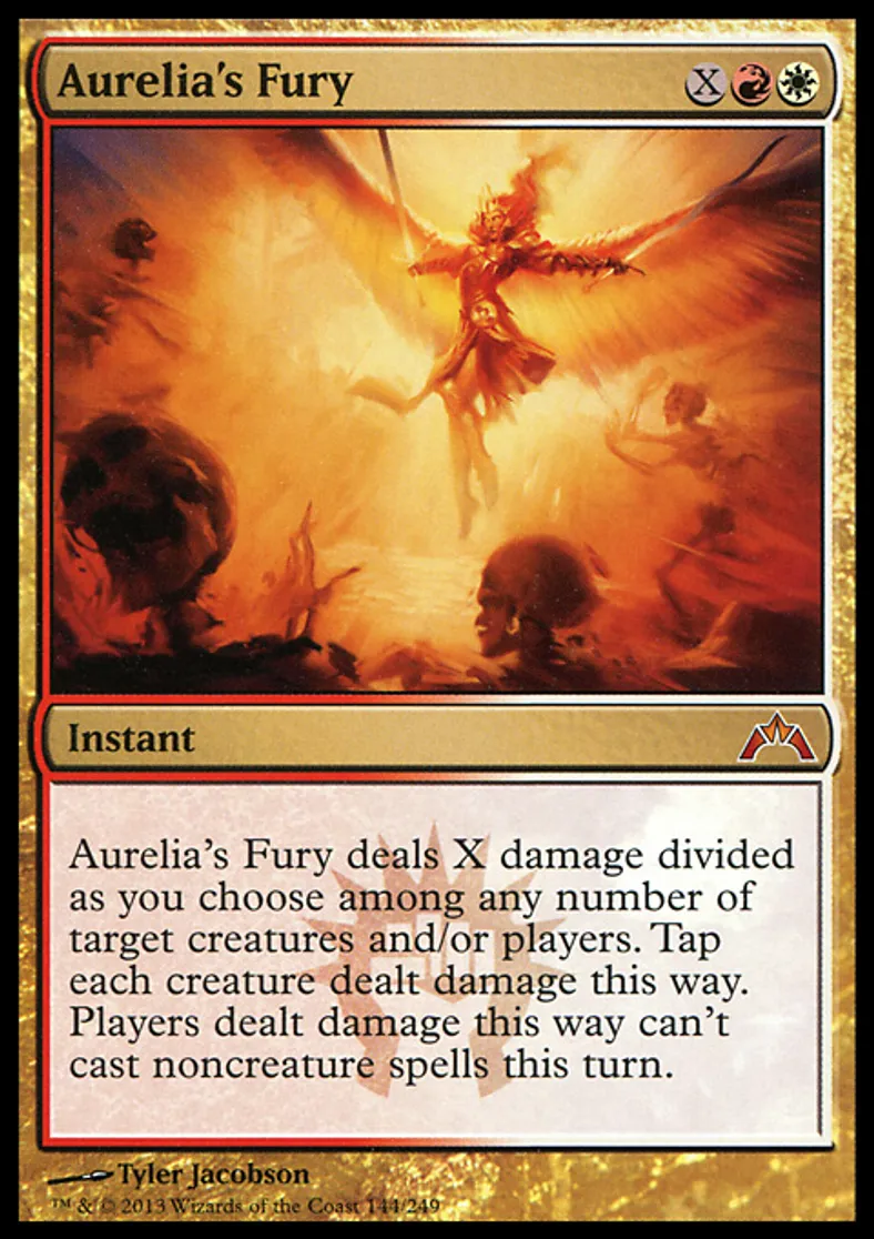 | Oracle Text | Aurelia's Fury deals X damage divided as you choose among any number of target creatures and/or players. Tap each creature dealt damage this way. Players dealt damage this way can't cast noncreature spells this turn. | ||