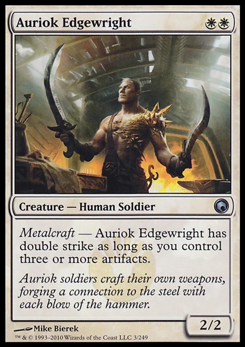 | Oracle Text | Metalcraft — Auriok Edgewright has double strike as long as you control three or more artifacts. | ||