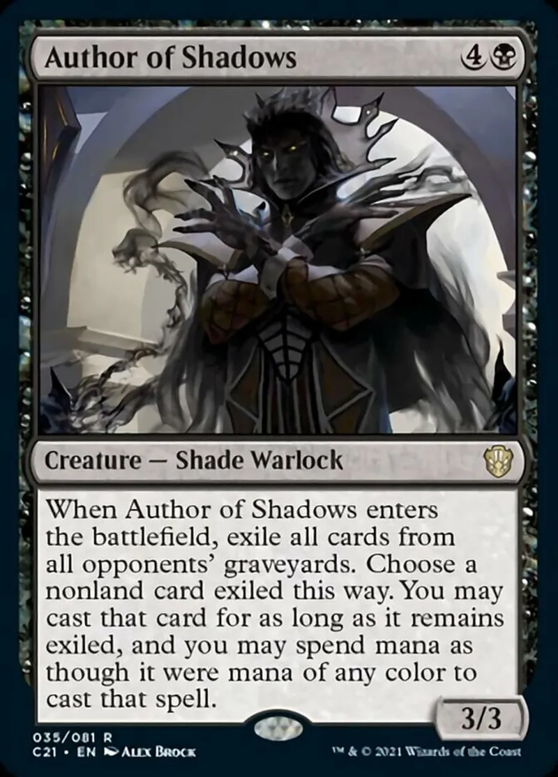| Oracle Text | When Author of Shadows enters the battlefield, exile all cards from all opponents' graveyards. Choose a nonland card exiled this way. You may cast that card for as long as it remains exiled, and you may spend mana as though it were mana of any color to cast that spell. | ||