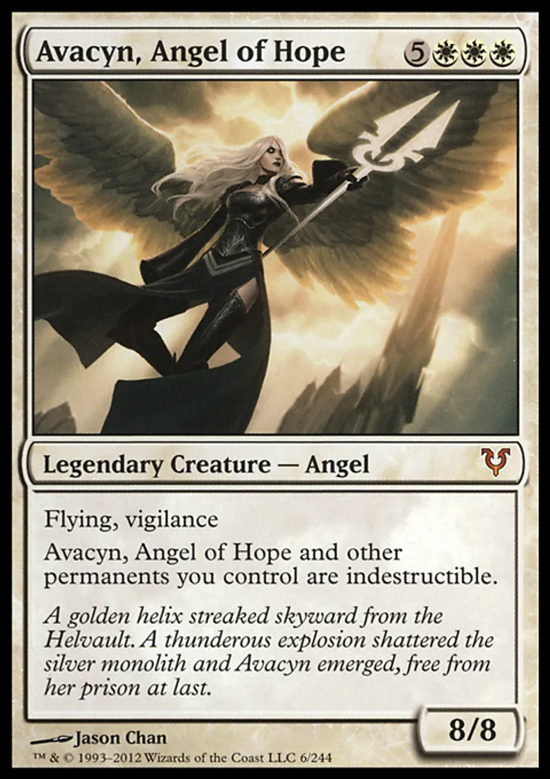 | Oracle Text | Flying, vigilance Avacyn, Angel of Hope and other permanents you control are indestructible. | ||