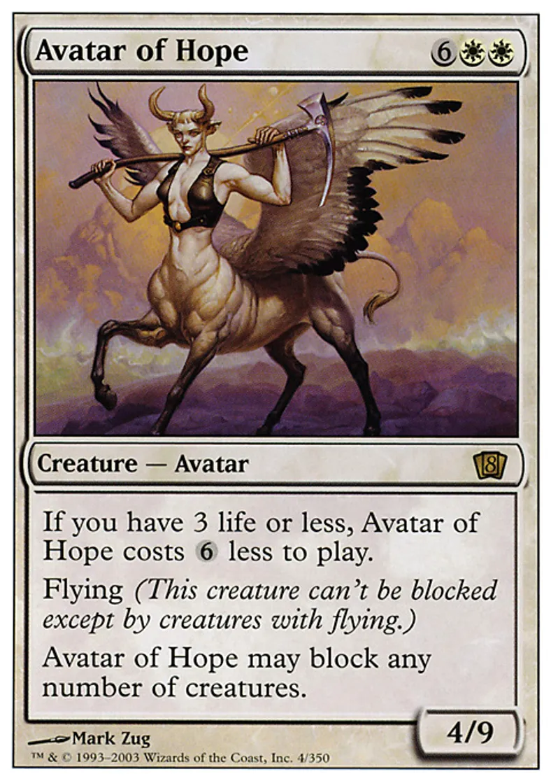 | Oracle Text | If you have 3 or less life, Avatar of Hope costs {{6}} less to cast. Flying Avatar of Hope can block any number of creatures. | ||