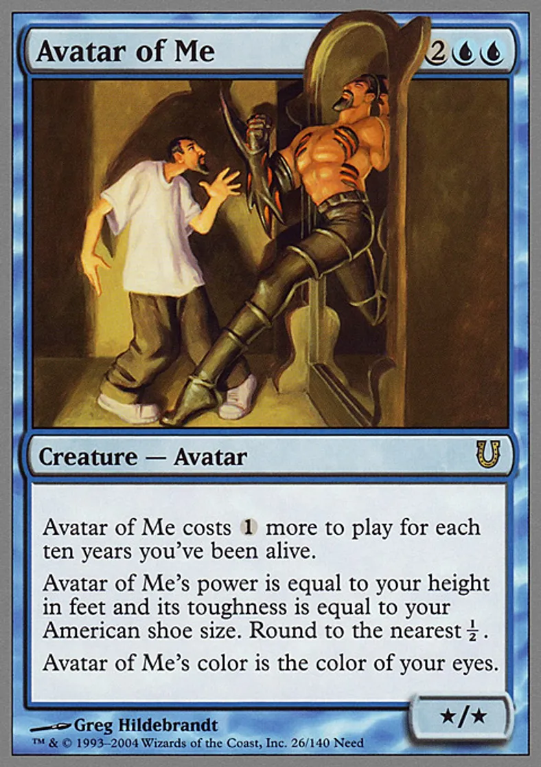 | Oracle Text | Avatar of Me costs {{1}} more to play for each ten years you've been alive. Avatar of Me's power is equal to your height in feet and its toughness is equal to your American shoe size. Round to the nearest ½. Avatar of Me's color is the color of your eyes. | ||