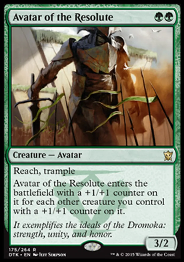 | Oracle Text | Reach, trample Avatar of the Resolute enters the battlefield with a +1/+1 counter on it for each other creature you control with a +1/+1 counter on it. | ||