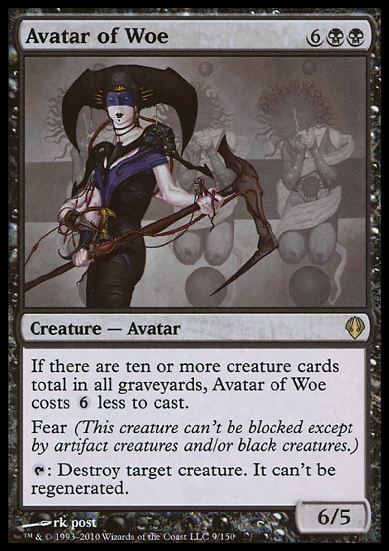 | Oracle Text | If there are ten or more creature cards total in all graveyards, Avatar of Woe costs {{6}} less to cast. Fear (This creature can't be blocked except by artifact creatures and/or black creatures.) {{t}}: Destroy target creature. It can't be regenerated. | ||