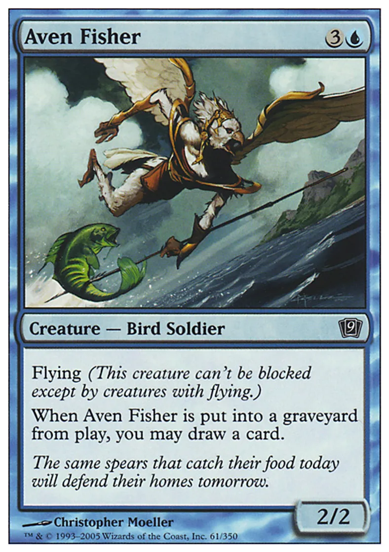 | Oracle Text | Flying (This creature can't be blocked except by creatures with flying or reach.) When Aven Fisher dies, you may draw a card. | ||