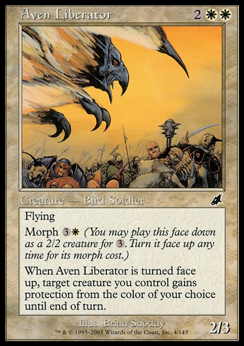 | Oracle Text | Flying Morph {{3}}{{w}} (You may cast this face down as a 2/2 creature for {{3}}. Turn it face up any time for its morph cost.) When Aven Liberator is turned face up, target creature you control gains protection from the color of your choice until end of turn. | ||