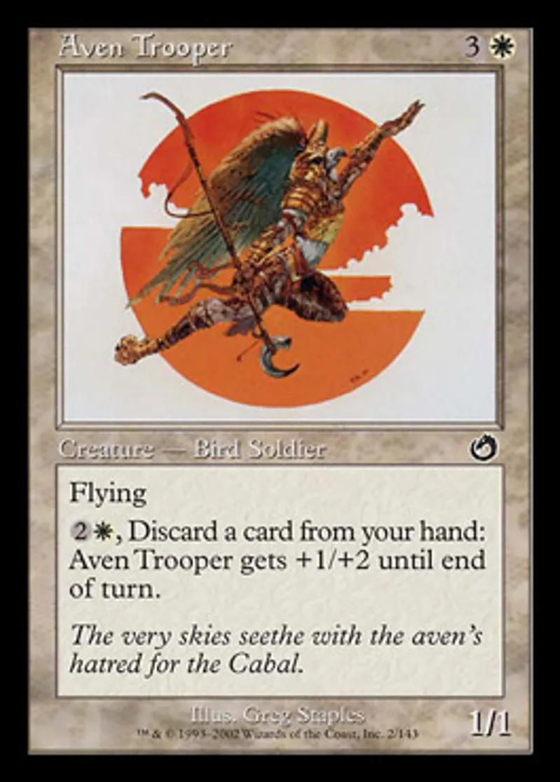 {2}{W}, Discard a card: Aven Trooper gets +1/+2 until end of turn. | ||