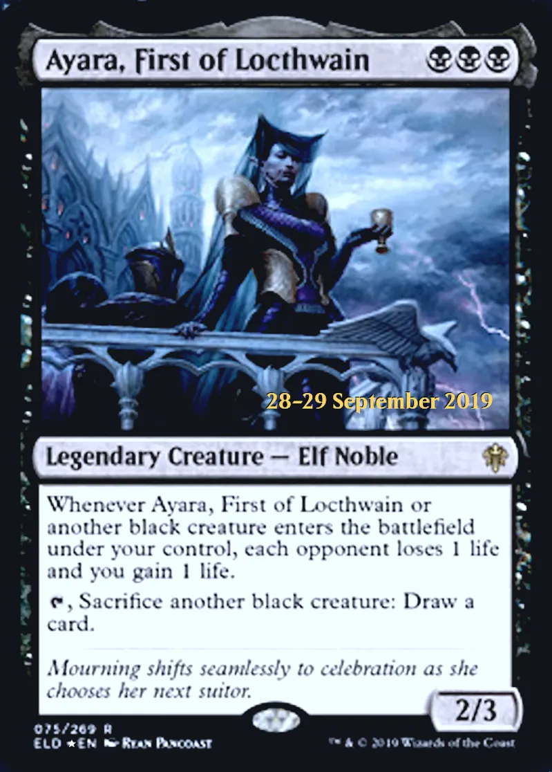 | Oracle Text | Whenever Ayara, First of Locthwain or another black creature enters the battlefield under your control, each opponent loses 1 life and you gain 1 life.\r\n{{t}}, Sacrifice another black creature: Draw a card. | ||