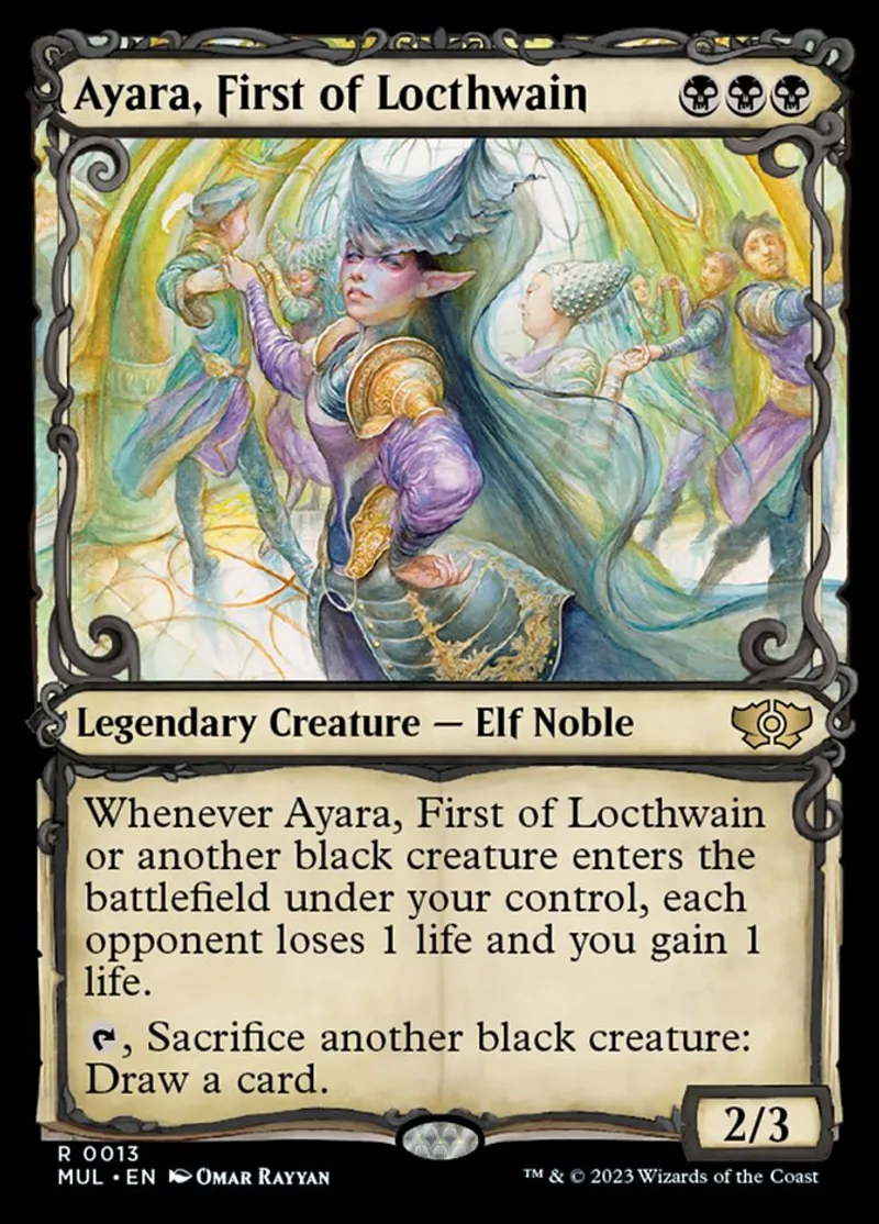 | Oracle Text | Whenever Ayara, First of Locthwain or another black creature enters the battlefield under your control, each opponent loses 1 life and you gain 1 life.