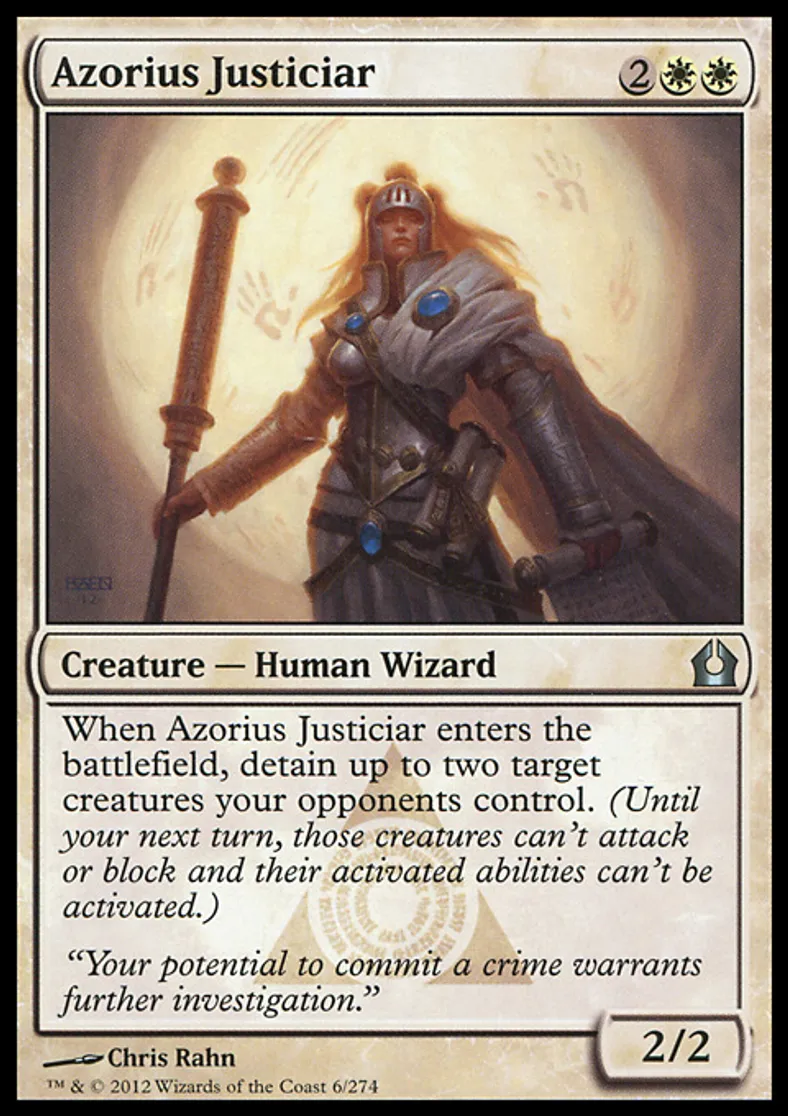 | Oracle Text | When Azorius Justiciar enters the battlefield, detain up to two target creatures your opponents control. (Until your next turn, those creatures can't attack or block and their activated abilities can't be activated.) | ||