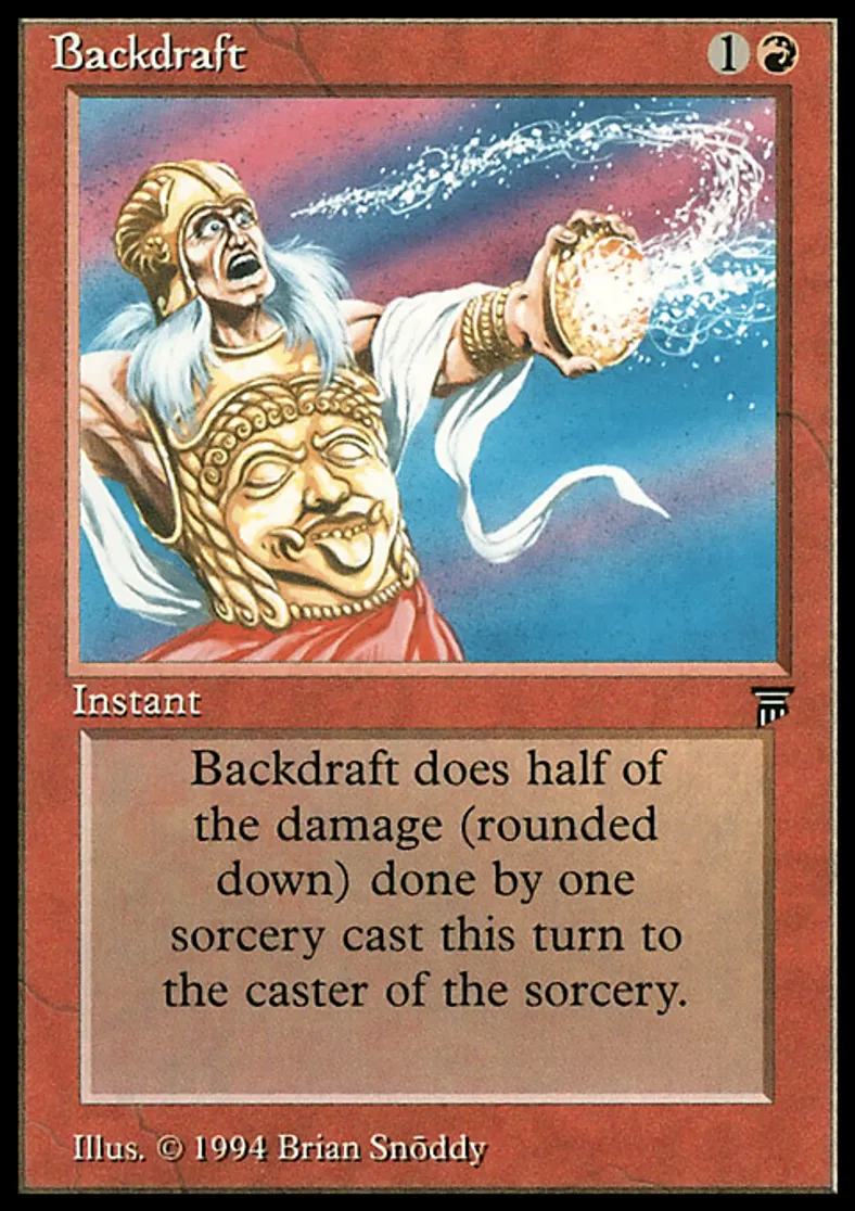 | Oracle Text | Choose a player who cast one or more sorcery spells this turn. Backdraft deals damage to that player equal to half the damage dealt by one of those sorcery spells this turn, rounded down. | ||