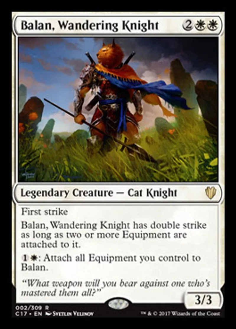 | Oracle Text | First strike Balan, Wandering Knight has double strike as long as two or more Equipment are attached to it. {{1}}{{w}}: Attach all Equipment you control to Balan. | ||