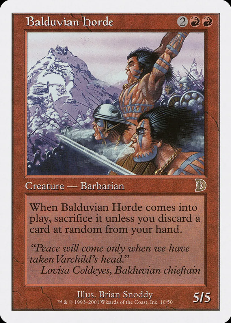 | Oracle Text | When Balduvian Horde enters the battlefield, sacrifice it unless you discard a card at random. | ||