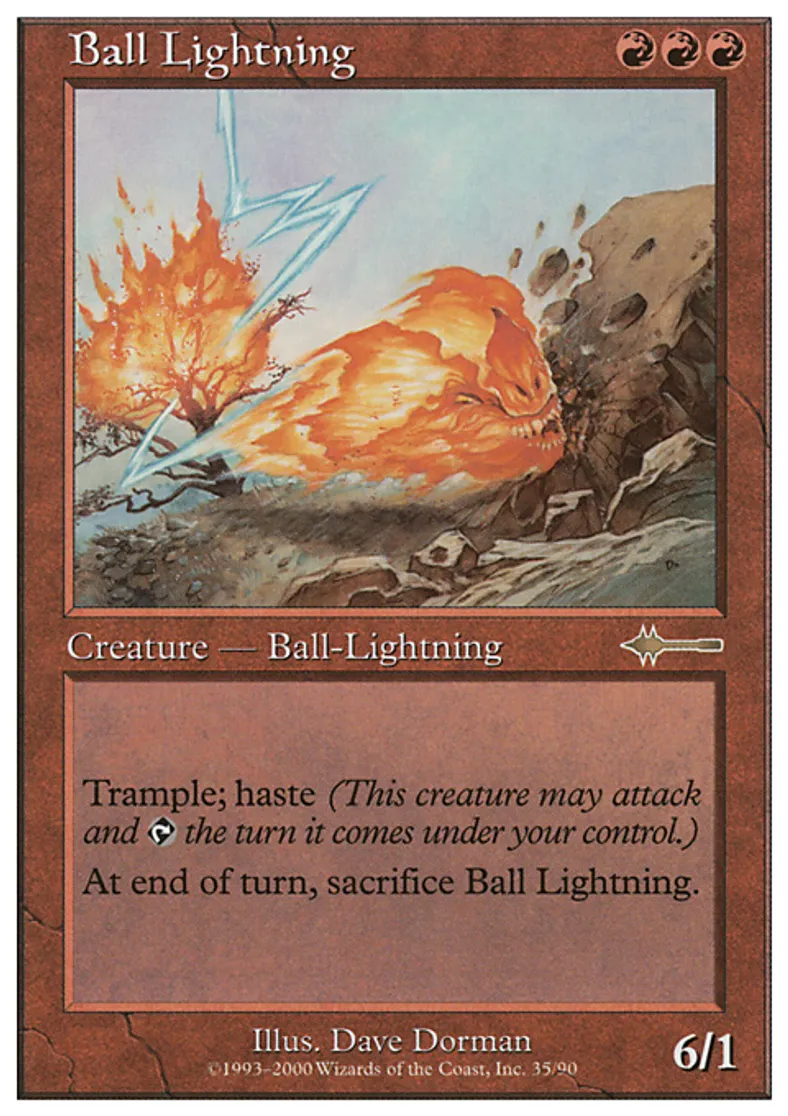 | Oracle Text | Trample (If this creature would assign enough damage to its blockers to destroy them, you may have it assign the rest of its damage to defending player or planeswalker.) Haste (This creature can attack and {{t}} as soon as it comes under your control.) At the beginning of the end step, sacrifice Ball Lightning. | ||