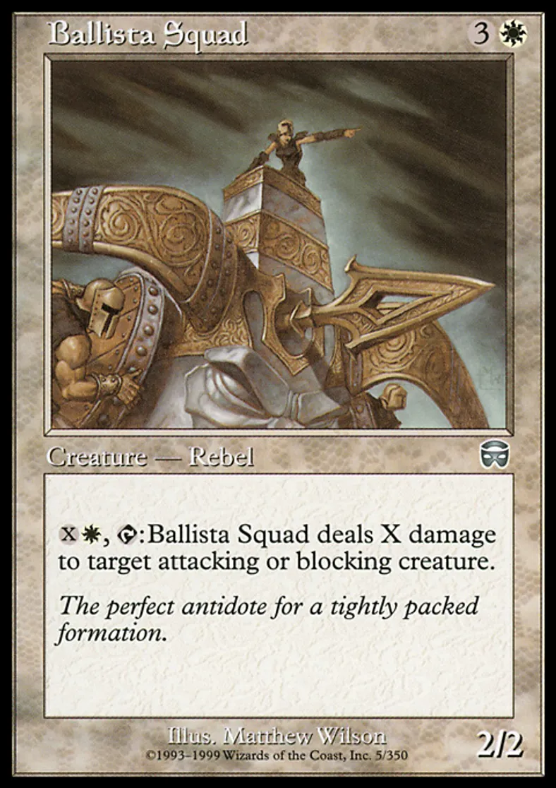 | Oracle Text | {{x}}{{w}}, {{t}}: Ballista Squad deals X damage to target attacking or blocking creature. | ||
