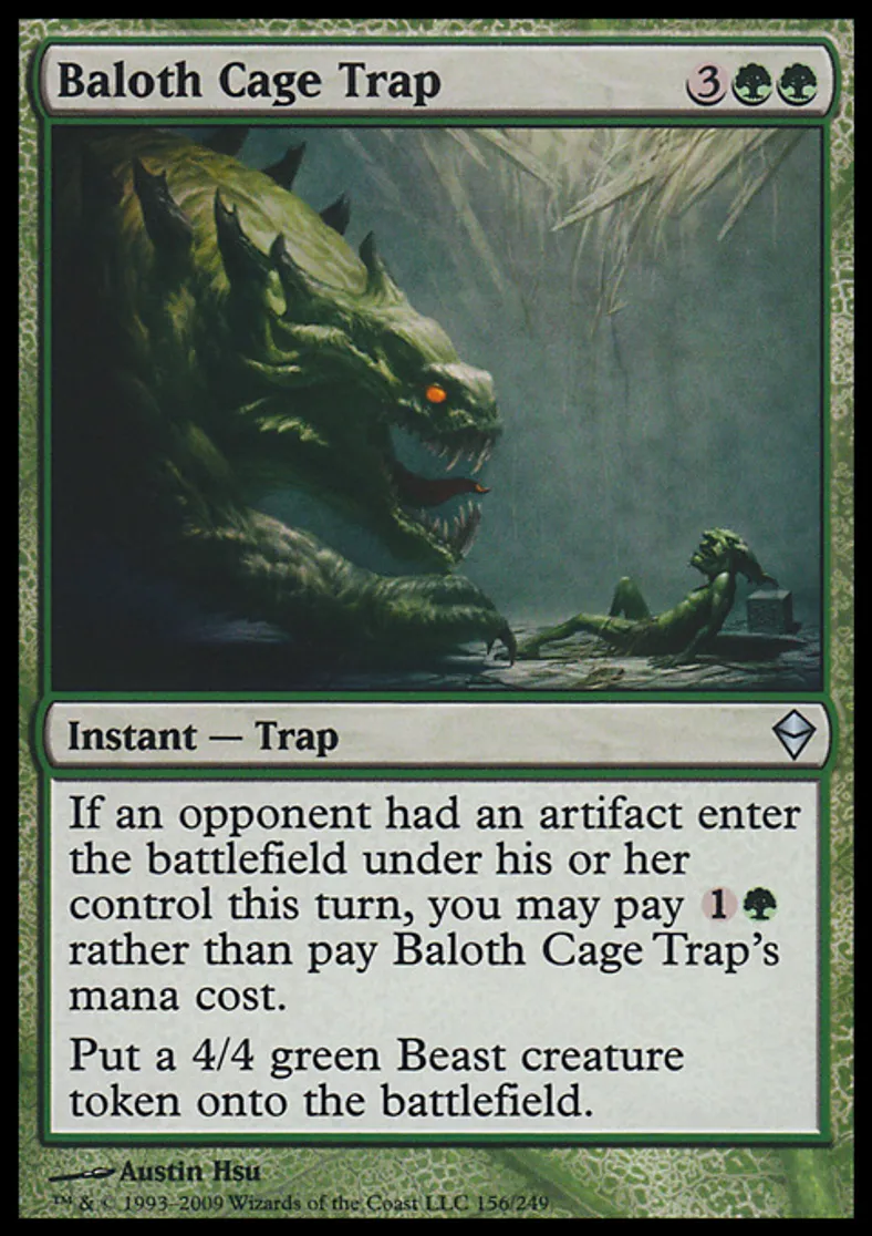 | Oracle Text | If an opponent had an artifact enter the battlefield under his or her control this turn, you may pay {{1}}{{g}} rather than pay Baloth Cage Trap's mana cost. Put a 4/4 green Beast creature token onto the battlefield. | ||