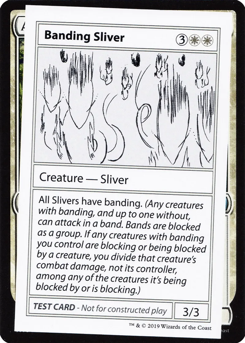 | Oracle Text | All Slivers have banding. (Any creatures with banding, and up to one without, can attack in a band. Bands are blocked as a group. If any creatures with banding you control are blocking or being blocked by a creature, you divide that creature’s combat damage, not its controller, among any of the creatures it’s being blocked by or is blocking.) | ||