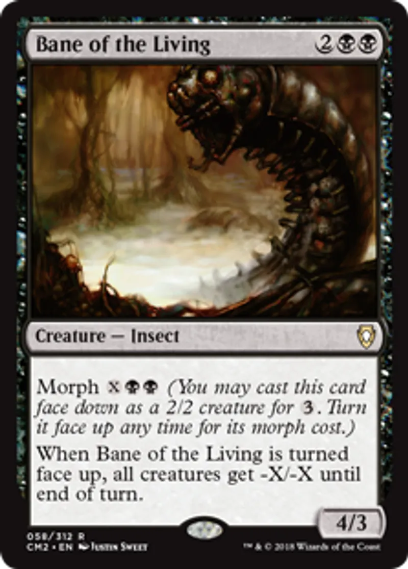 | Oracle Text | Morph {{x}}{{b}}{{b}} (You may cast this card face down as a 2/2 creature for {{3}}. Turn it face up any time for its morph cost.) When Bane of the Living is turned face up, all creatures get -X/-X until end of turn. | ||