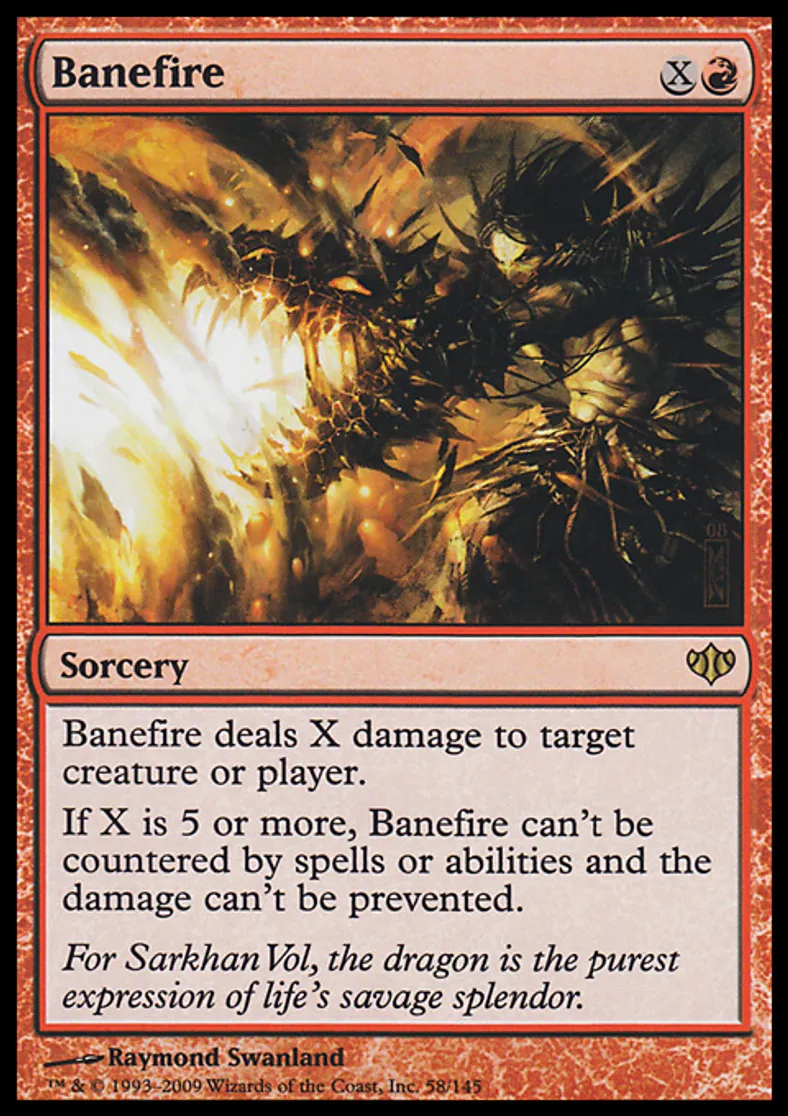 | Oracle Text | Banefire deals X damage to target creature or player. If X is 5 or more, Banefire can't be countered by spells or abilities and the damage can't be prevented. | ||