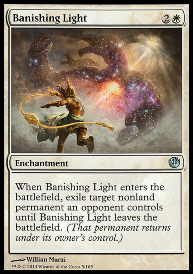 | Oracle Text | When Banishing Light enters the battlefield, exile target nonland permanent an opponent controls until Banishing Light leaves the battlefield. (That permanent returns under its owner's control.) | ||