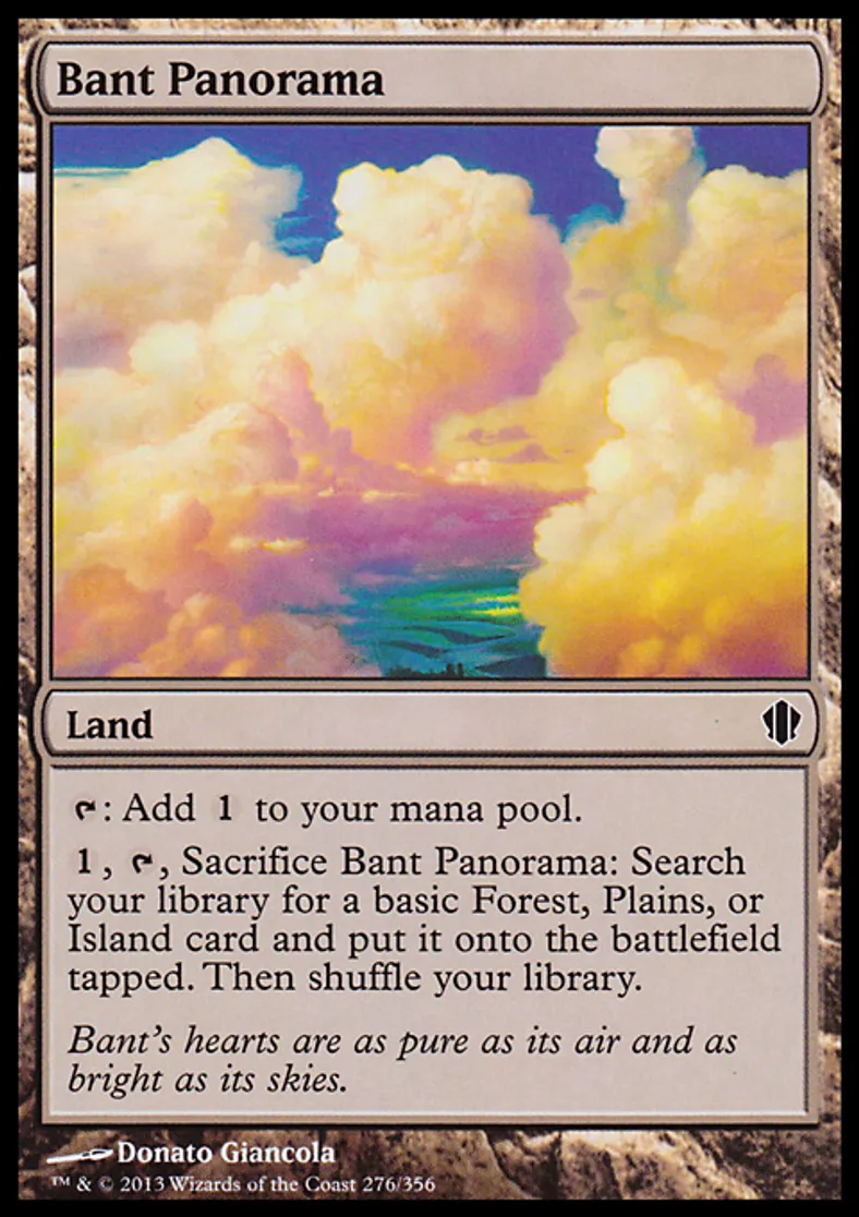 | Oracle Text | {{t}}: Add {{1}} to your mana pool. {{1}}, {{t}}, Sacrifice Bant Panorama: Search your library for a basic Forest, Plains, or Island card and put it onto the battlefield tapped. Then shuffle your library. | ||