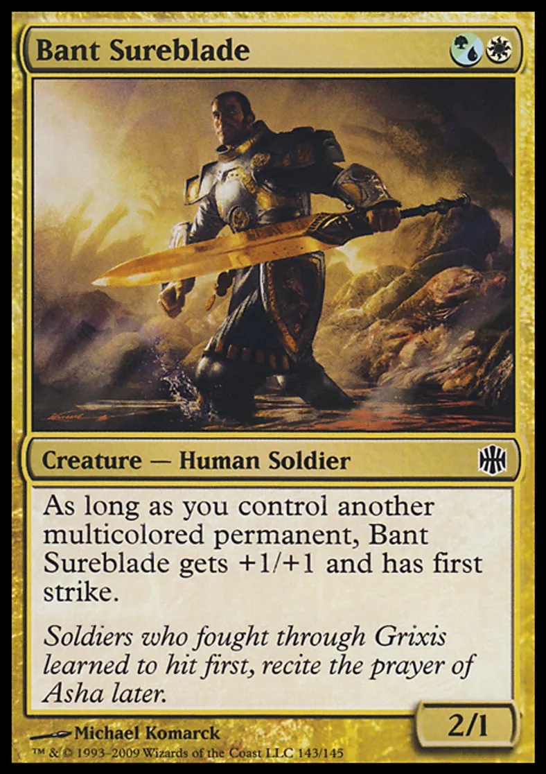 | Oracle Text | As long as you control another multicolored permanent, Bant Sureblade gets +1/+1 and has first strike. | ||