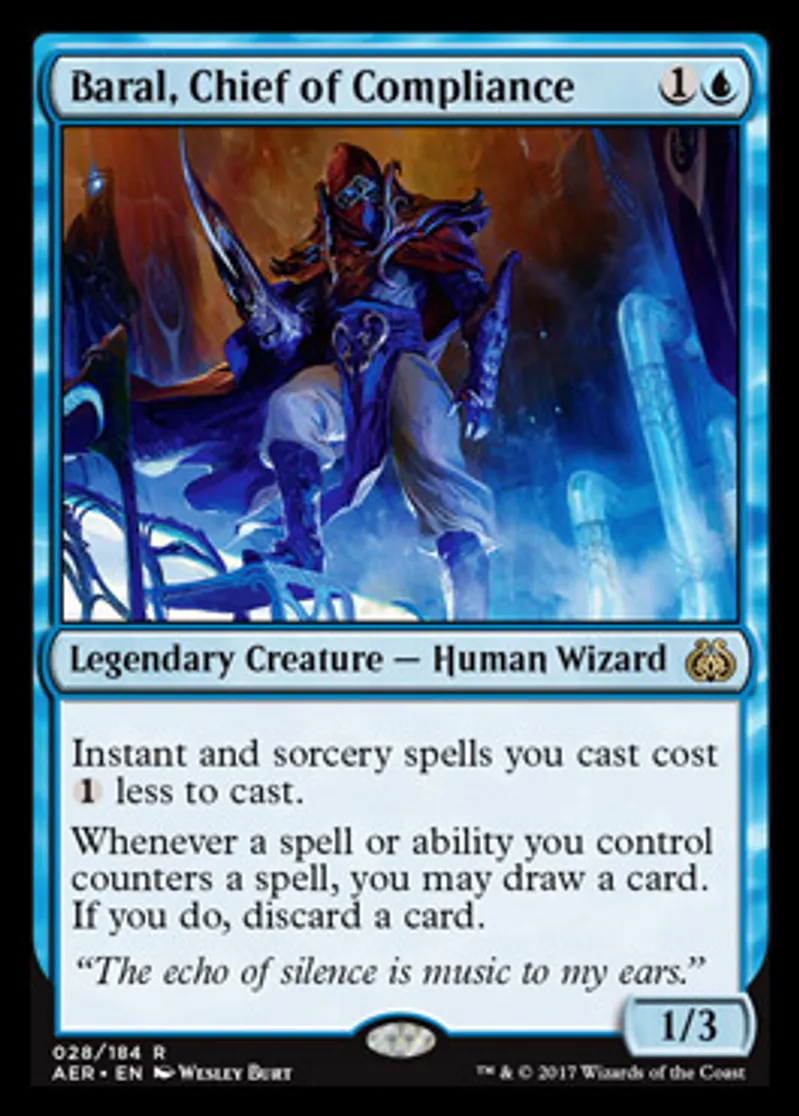 Magic: the Gathering (mtg) Rare Legendary Creature - Human Wizard Baral, Chief of Compliance from Aether Revolt (AER) last updated 2026-02-24 16:03:36