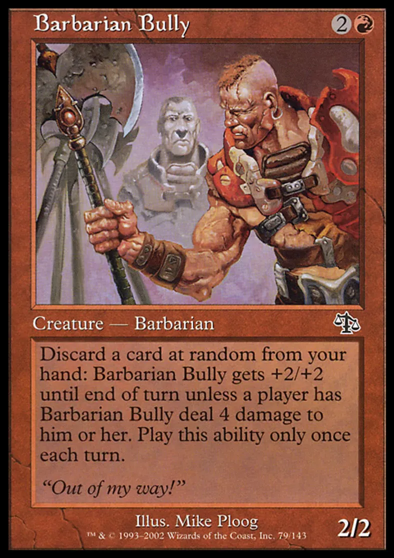 | Oracle Text | Discard a card at random: Barbarian Bully gets +2/+2 until end of turn unless a player has Barbarian Bully deal 4 damage to him or her. Activate this ability only once each turn. | ||