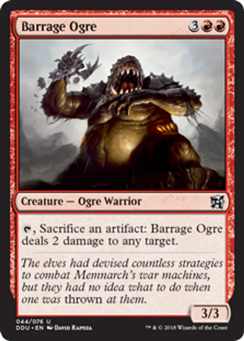 | Oracle Text | {{t}}, Sacrifice an artifact: Barrage Ogre deals 2 damage to target creature or player. | ||