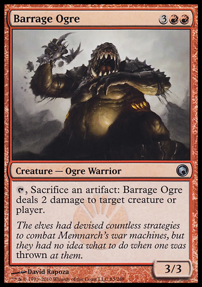 | Oracle Text | {{t}}, Sacrifice an artifact: Barrage Ogre deals 2 damage to target creature or player. | ||
