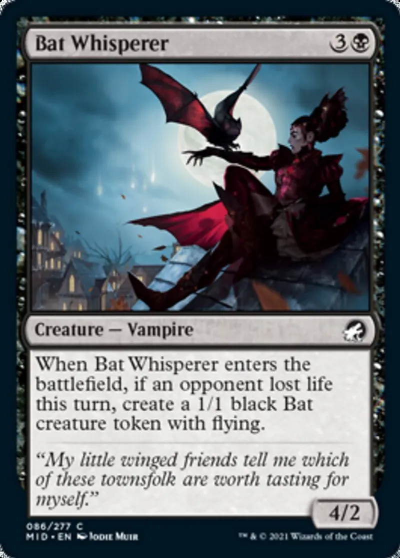| Oracle Text | When Bat Whisperer enters the battlefield, if an opponent lost life this turn, create a 1/1 black Bat creature token with flying. | ||