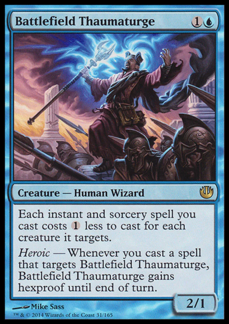 | Oracle Text | Each instant and sorcery spell you cast costs {{1}} less to cast for each creature it targets. Heroic — Whenever you cast a spell that targets Battlefield Thaumaturge, Battlefield Thaumaturge gains hexproof until end of turn. | ||