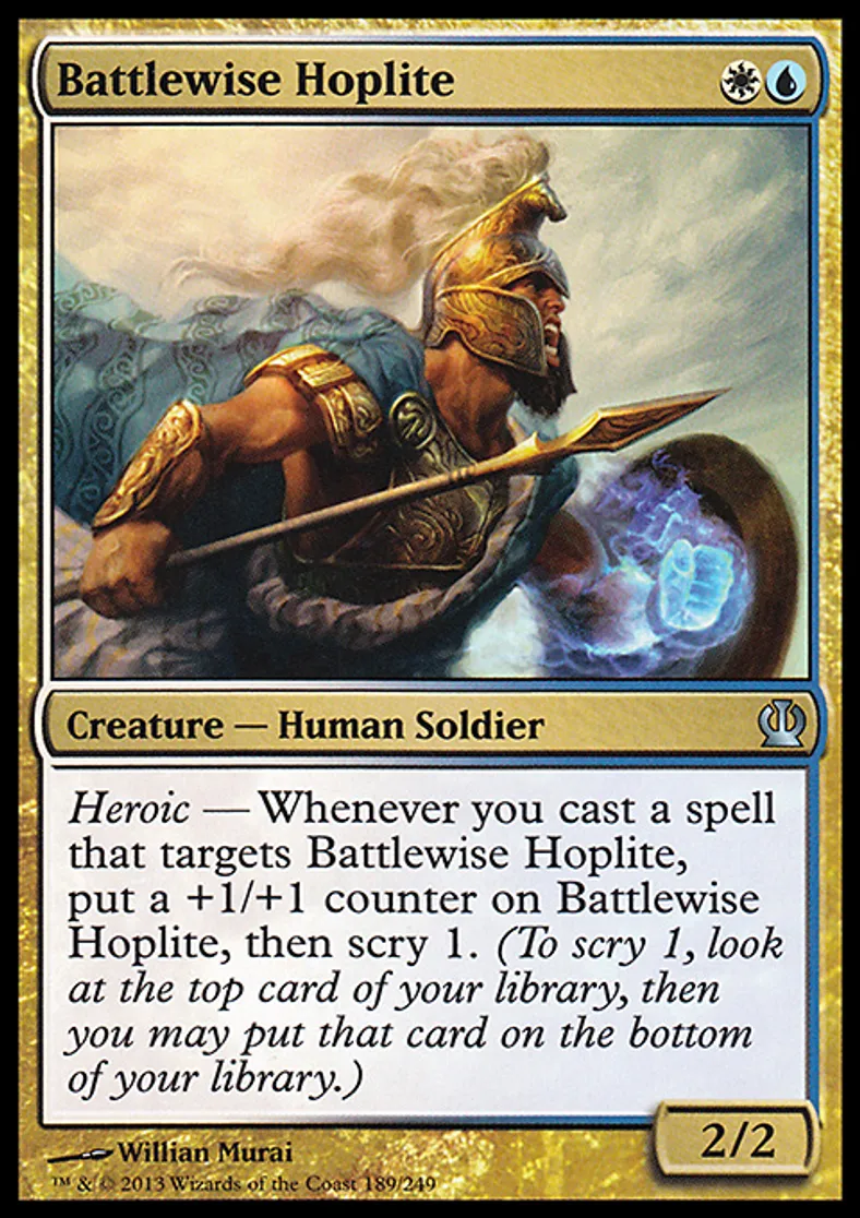 | Oracle Text | Heroic — Whenever you cast a spell that targets Battlewise Hoplite, put a +1/+1 counter on Battlewise Hoplite, then scry 1. (To scry 1, look at the top card of your library, then you may put that card on the bottom of your library.) | ||