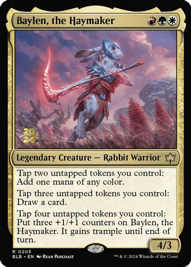 Magic: the Gathering (mtg) Rare legendary creature — rabbit warrior Baylen, the Haymaker from Prerelease Cards (pPRE) last updated 2026-02-25 15:19:02