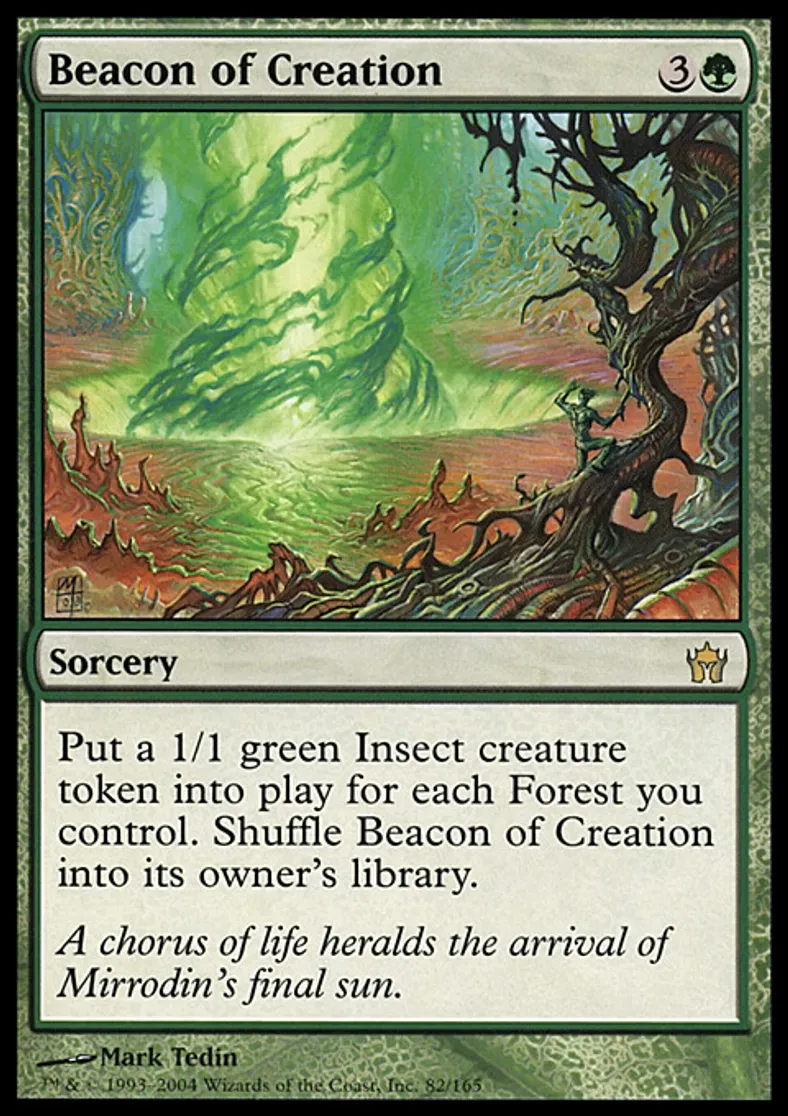 | Oracle Text | Put a 1/1 green Insect creature token onto the battlefield for each Forest you control. Shuffle Beacon of Creation into its owner's library. | ||