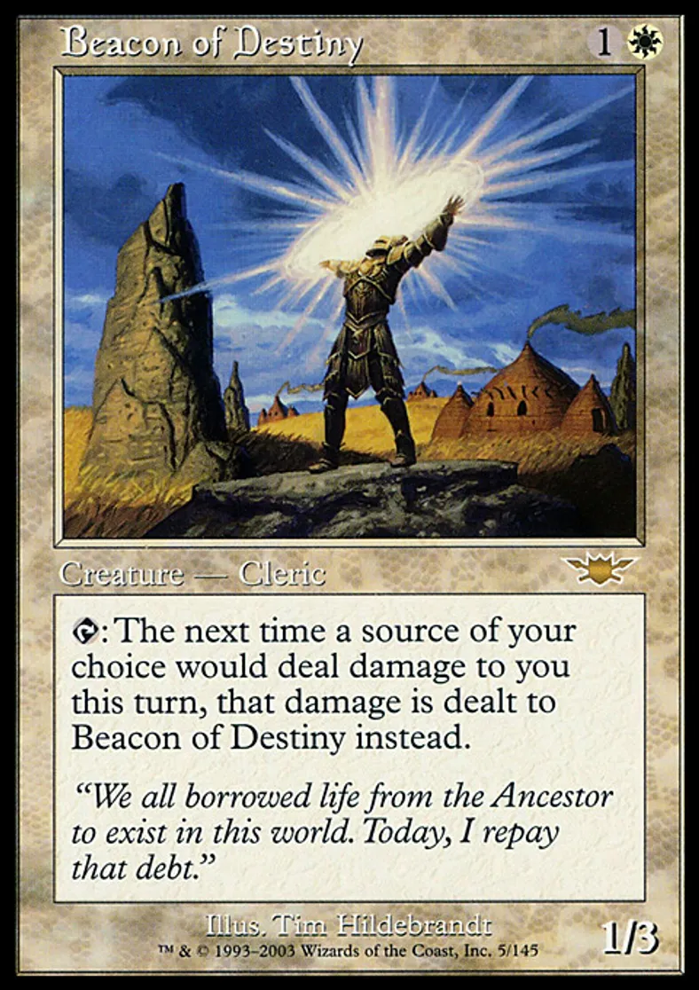 | Oracle Text | {{t}}: The next time a source of your choice would deal damage to you this turn, that damage is dealt to Beacon of Destiny instead. | ||