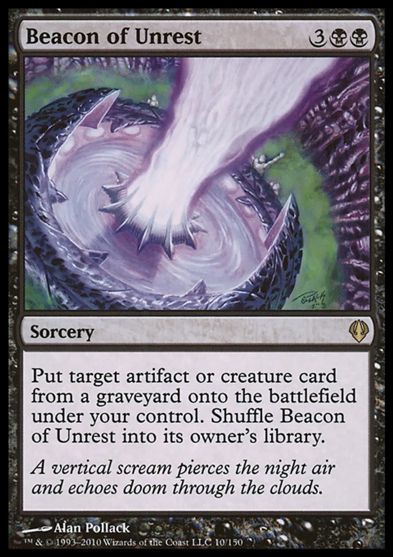 | Oracle Text | Put target artifact or creature card from a graveyard onto the battlefield under your control. Shuffle Beacon of Unrest into its owner's library. | ||