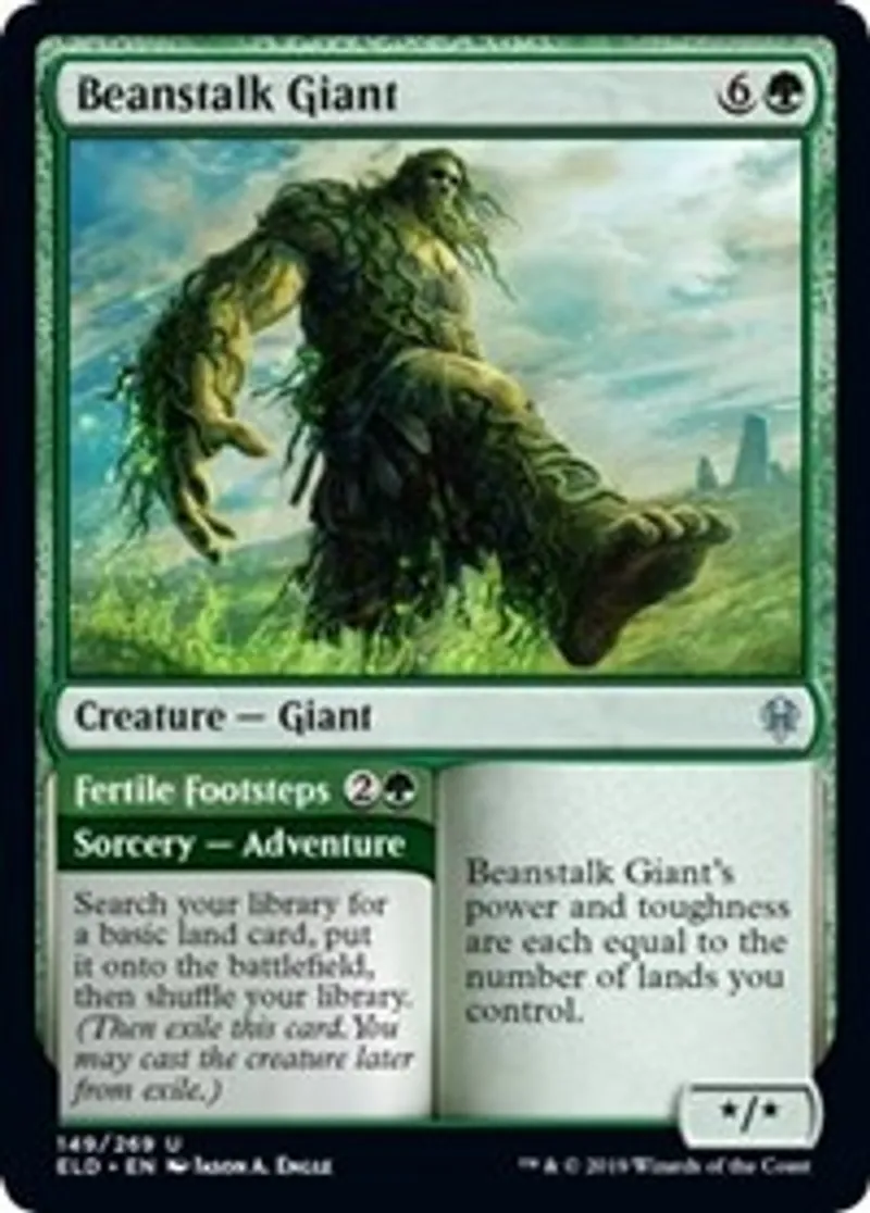 | Oracle Text | Beanstalk Giant\'s power and toughness are each equal to the number of lands you control. \r\n\r\nFertile Footsteps {{G}} \r\nSorcery — Adventure \r\nSearch your library for a basic land card, put it onto the battlefield, then shuffle your library. (Then exile this card. You may cast the creature later from exile.) | ||