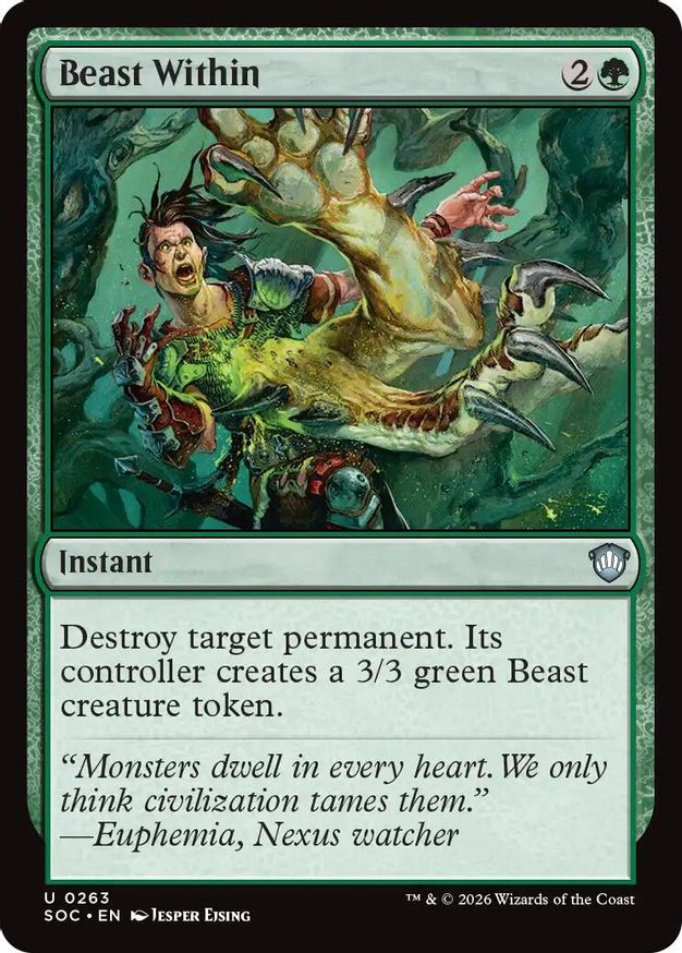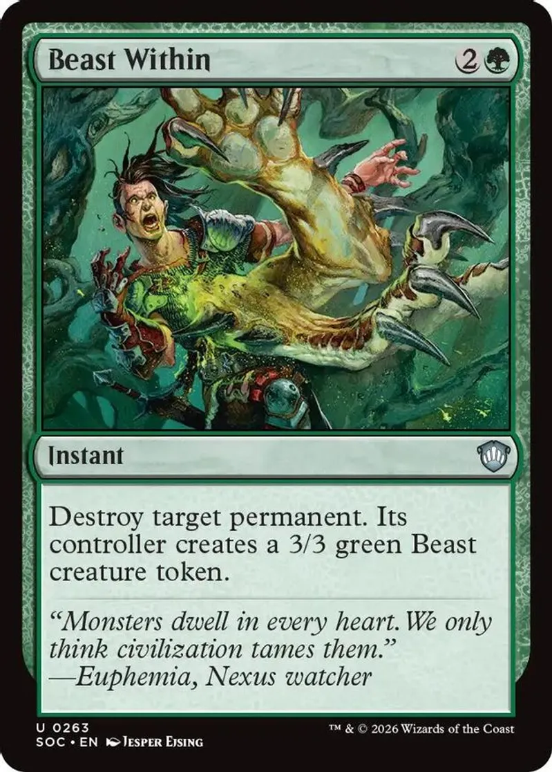Magic: the Gathering (mtg) Uncommon instant Beast Within from Commander: Secrets of Strixhaven (SOC) last updated 2026-04-20 15:37:05