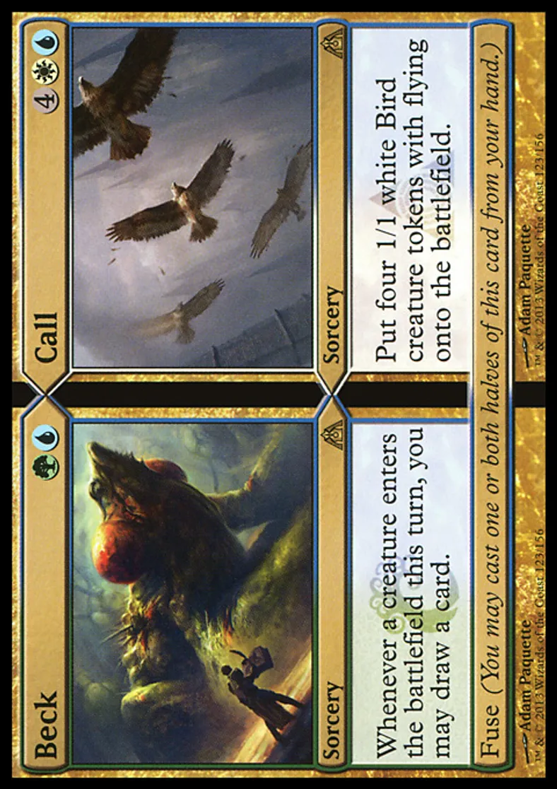 | Oracle Text | Put four 1/1 white Bird creature tokens with flying onto the battlefield. Fuse (You may cast one or both halves of this card from your hand.) | ||