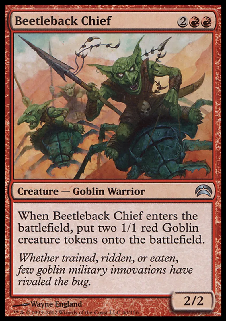 | Oracle Text | When Beetleback Chief enters the battlefield, put two 1/1 red Goblin creature tokens onto the battlefield. | ||