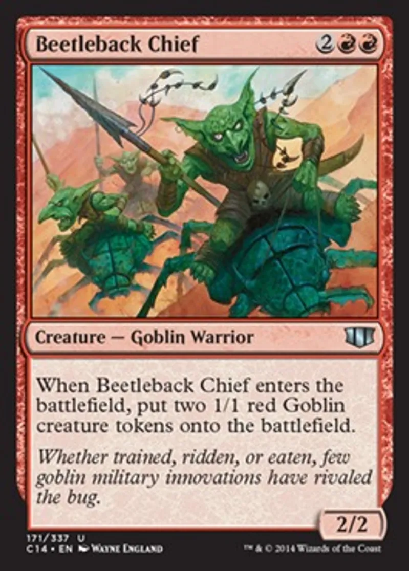 | Oracle Text | When Beetleback Chief enters the battlefield, put two 1/1 red Goblin creature tokens onto the battlefield. | ||