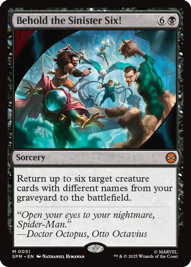 Magic: the Gathering (mtg) Mythic Rare sorcery Behold the Sinister Six! from Marvel's Spider-Man (SPM) last updated 2025-12-05 15:20:05