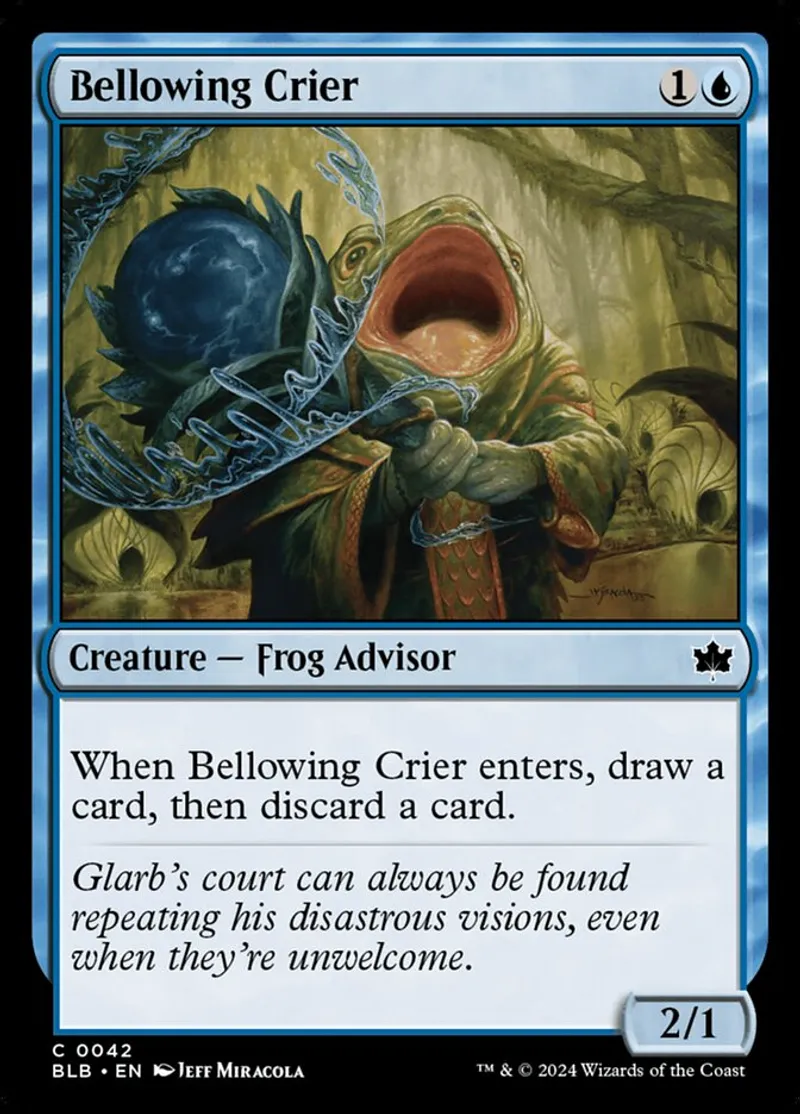 Magic: the Gathering (mtg) common Creature — Frog Advisor Bellowing Crier from Bloomburrow (blb) last updated 2026-02-21 15:24:32