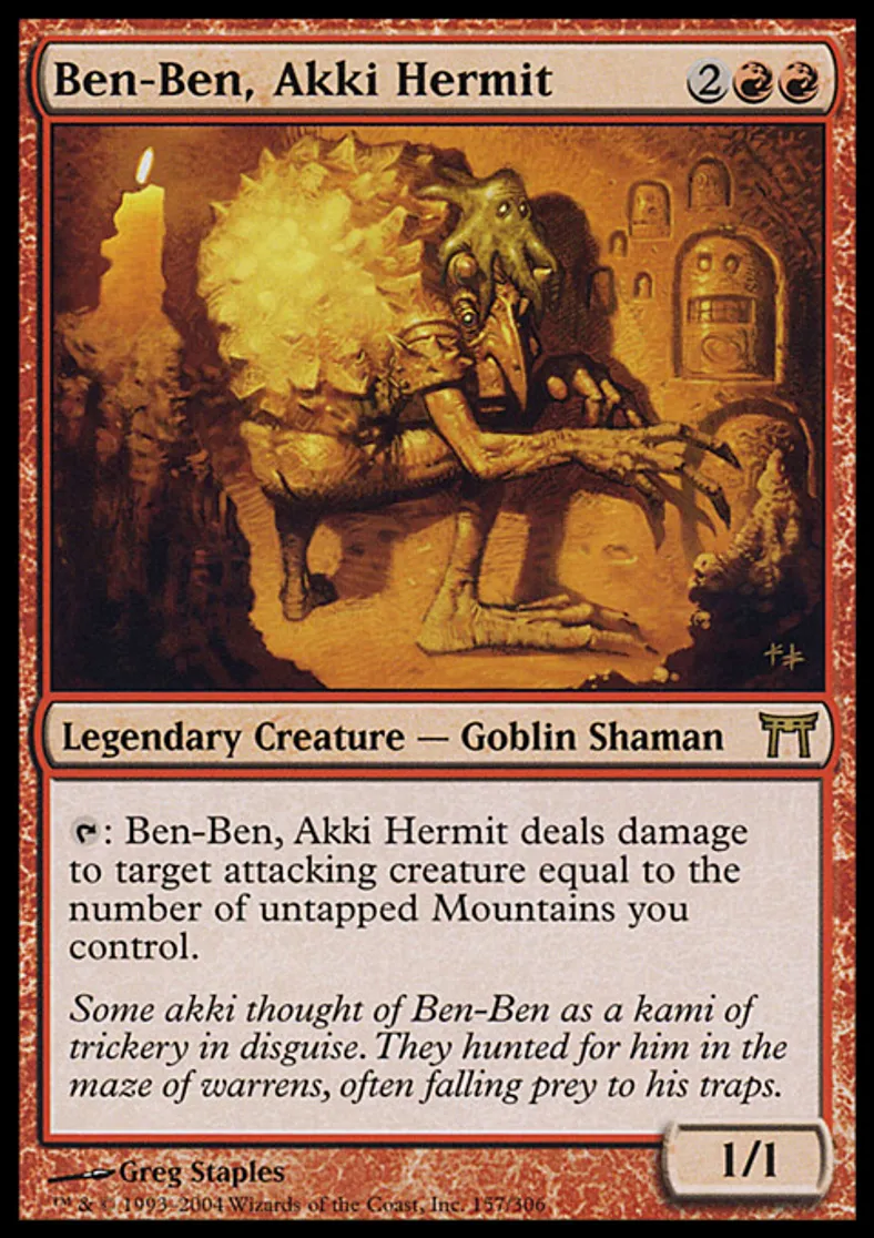 | Oracle Text | {{t}}: Ben-Ben, Akki Hermit deals damage to target attacking creature equal to the number of untapped Mountains you control. | ||