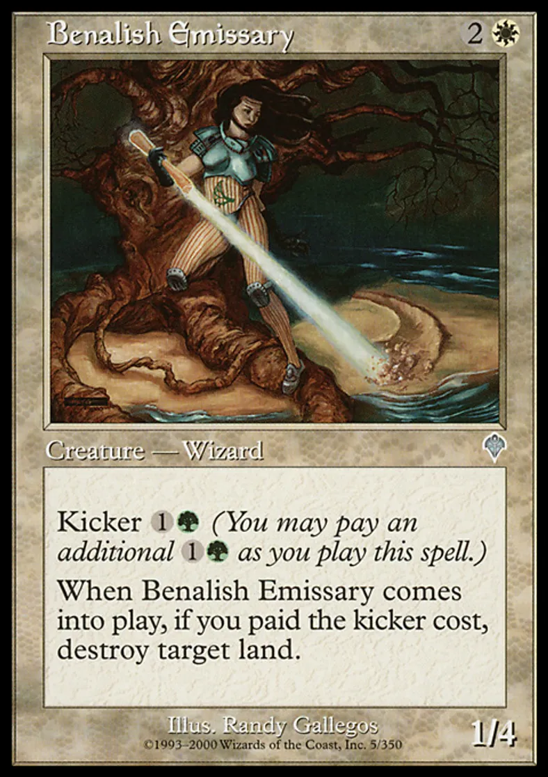 | Oracle Text | Kicker {{1}}{{g}} (You may pay an additional {{1}}{{g}} as you cast this spell.) When Benalish Emissary enters the battlefield, if it was kicked, destroy target land. | ||