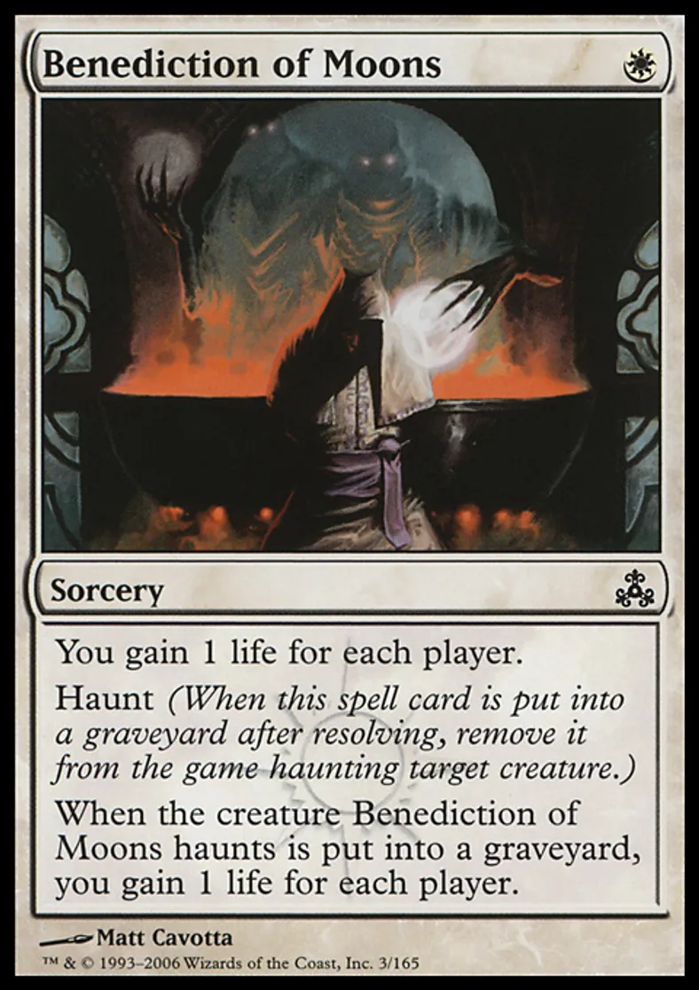 | Oracle Text | You gain 1 life for each player. Haunt (When this spell card is put into a graveyard after resolving, exile it haunting target creature.) When the creature Benediction of Moons haunts dies, you gain 1 life for each player. | ||