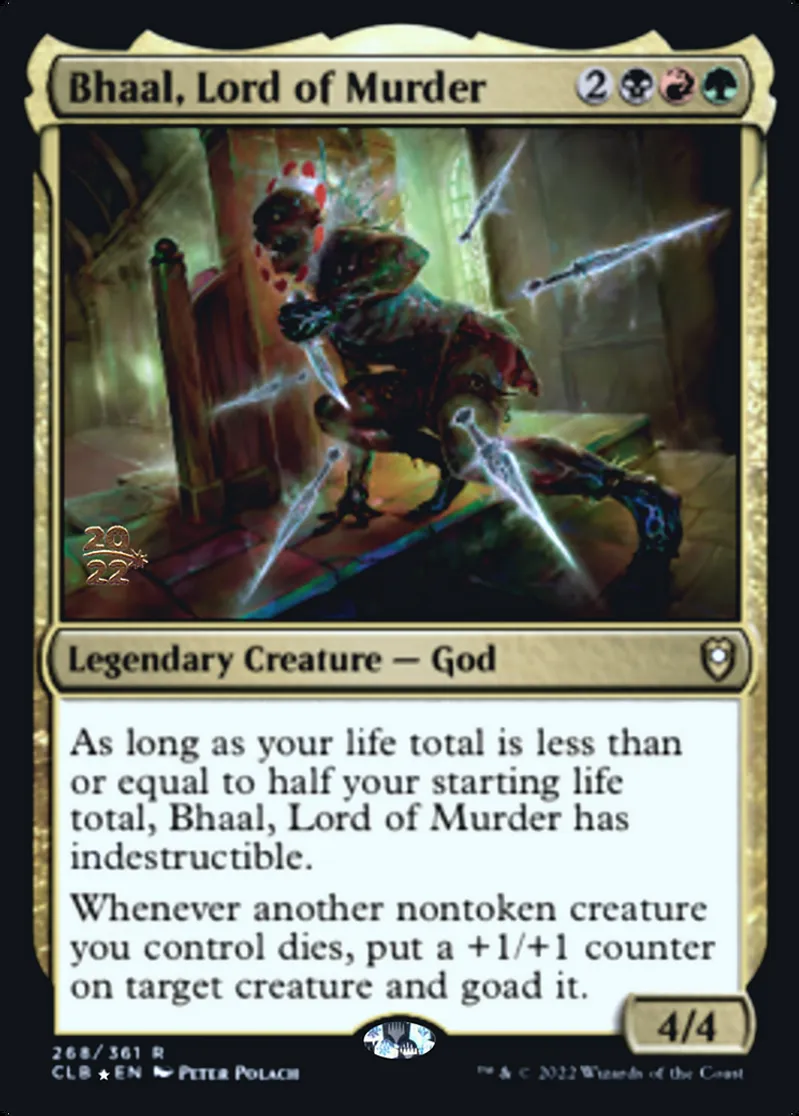 | Oracle Text | As long as your life total is less than or equal to half your starting life total, Bhaal, Lord of Murder has indestructible.
